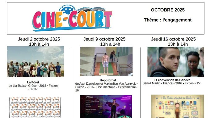 Par ALINE BOUSQUET, publié le mardi 21 octobre 2025 10:31 - Mis à jour le mardi 21 octobre 2025 10:31Le thème de ce premier Ciné-Court est l'engagement avec une sélection autour de la préservation de l'environnement, de l'empathie et du vivre ensemble.