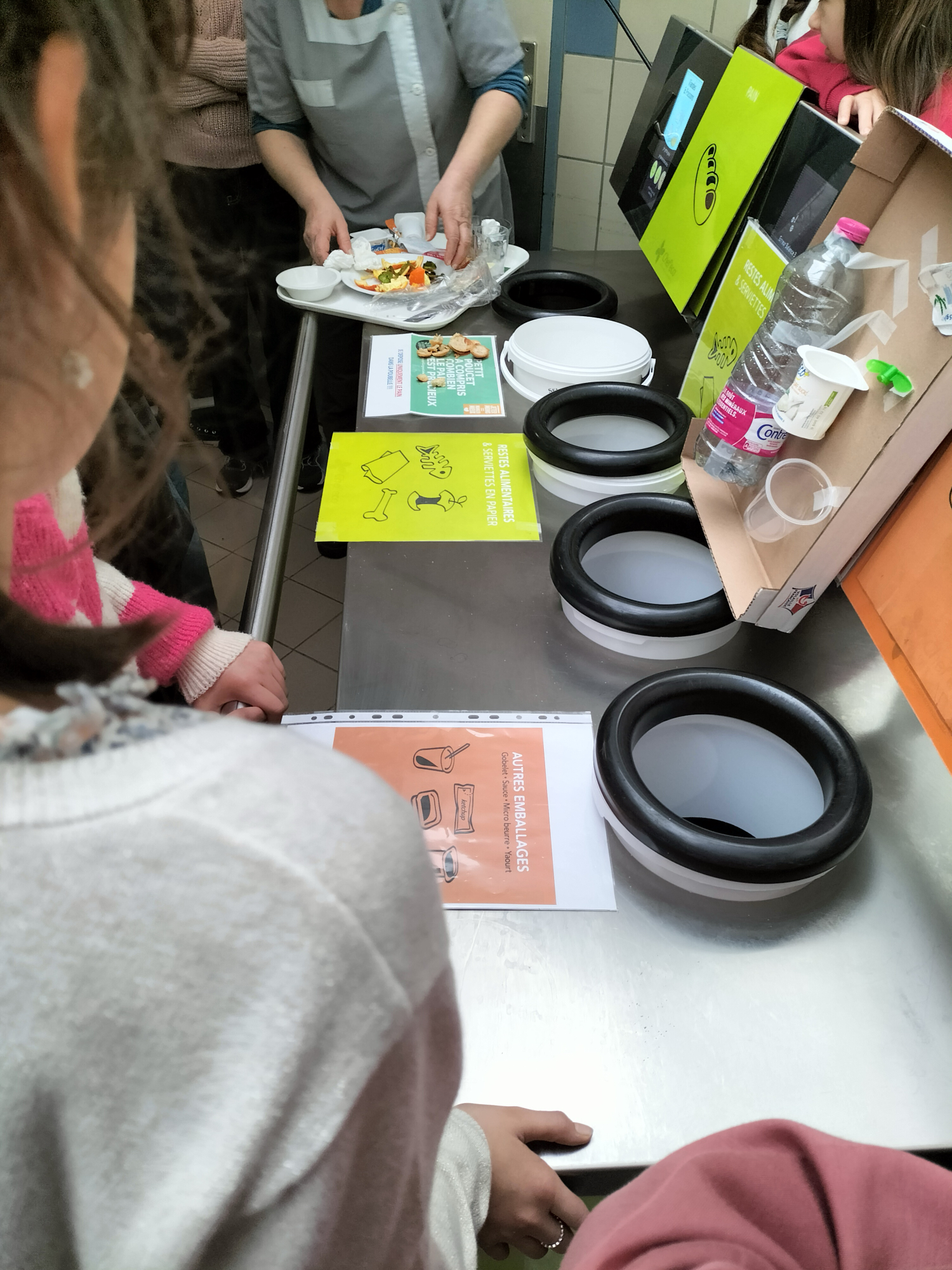 cuisine du collège Jean Jaurès. Corentin et Martine, deux agents travaillant en cuisine ont sensibilisé les élèves sur le gaspillage alimentaire, les produits de saison et les produits un peu abimés et toujours bon à consommer. Les DLC et DLUO n'ont plus de secrets pour les élèves. Ils ont également été sensibilisés à un rangement réfléchi de leurs déchets dans le plateau afin de mieux les trier ensuite sur la table de tri.